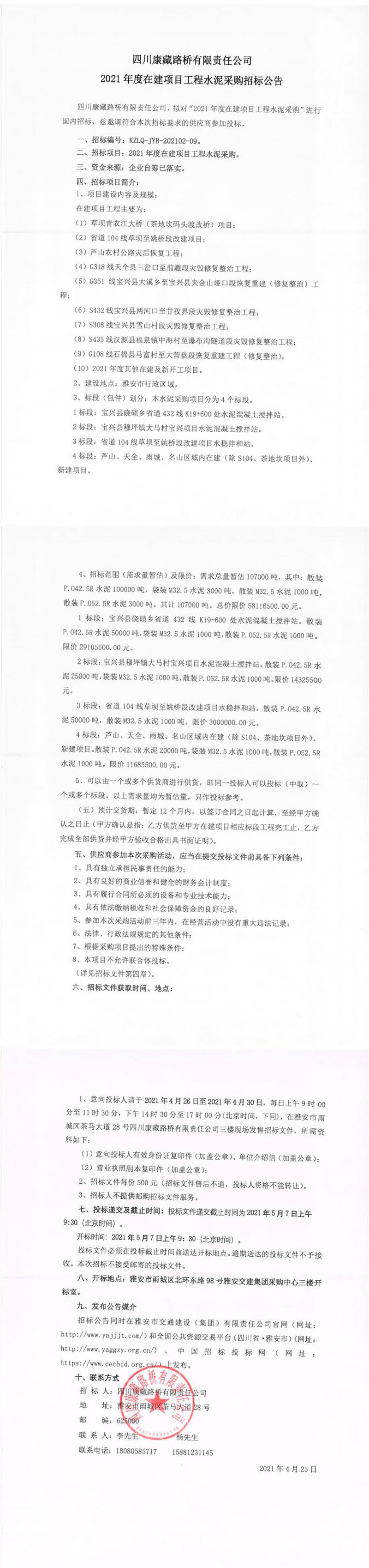 四川康藏路橋有限責(zé)任公司2021年度在建項(xiàng)目工程水泥采購招標(biāo)公告