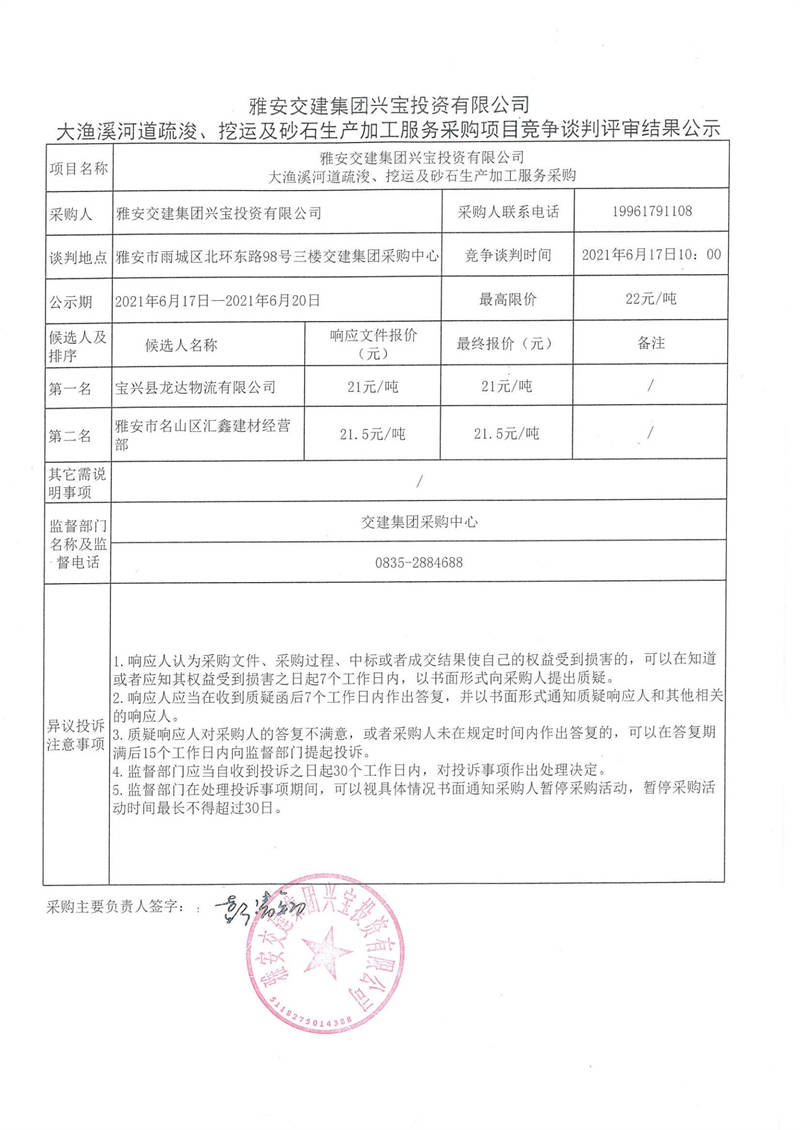 雅安交建集團(tuán)興寶投資有限公司大漁溪河道疏浚、挖運(yùn)及砂石生產(chǎn)加工服務(wù)采購項(xiàng)目競爭談判評審結(jié)果公示