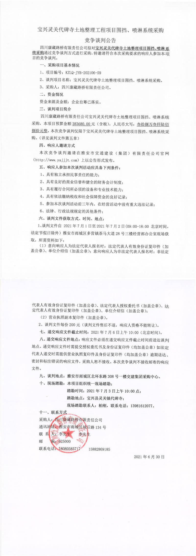 四川康藏路橋有限責任公司寶興靈關代碑寺土地整理工程項目圍擋、噴淋系統(tǒng)采購競爭談判公告