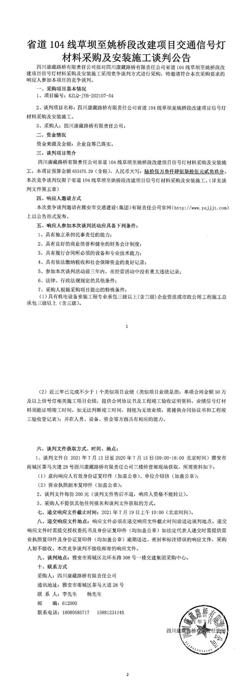 四川康藏路橋有限責任公司省道104線草壩至姚橋段改建項目交通信號燈材料采購及安裝施工競爭談判公告