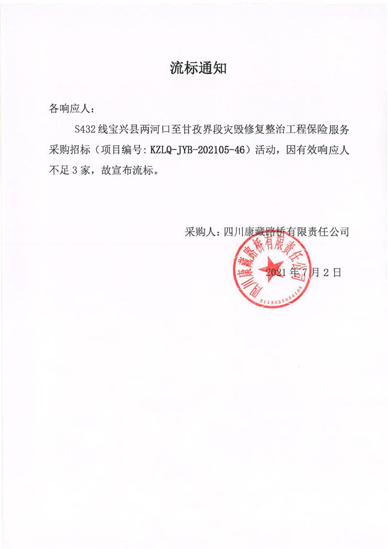 四川康藏路橋有限責(zé)任公司S432線寶興縣兩河口至甘孜界段災(zāi)毀修復(fù)整治工程保險服務(wù)采購流標(biāo)通知