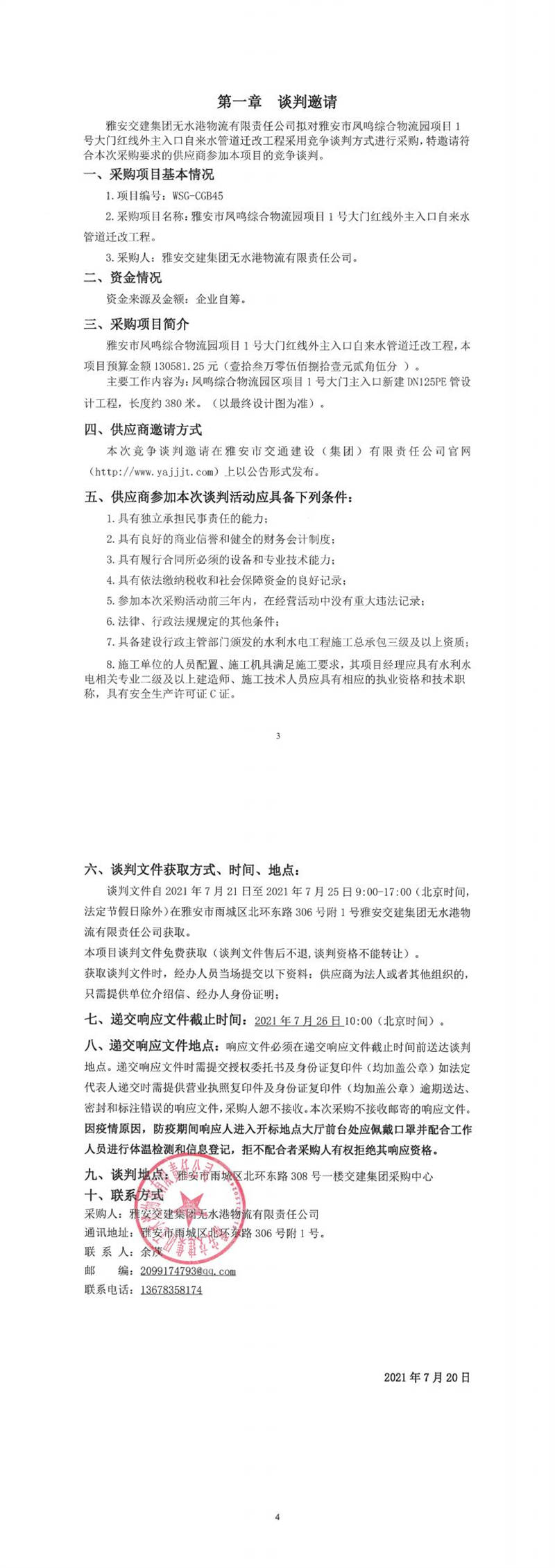 雅安交建集團無水港物流有限責(zé)任公司雅安市鳳鳴綜合物流園項目1號大門紅線外主入口自來水管道遷改工程競爭談判公告