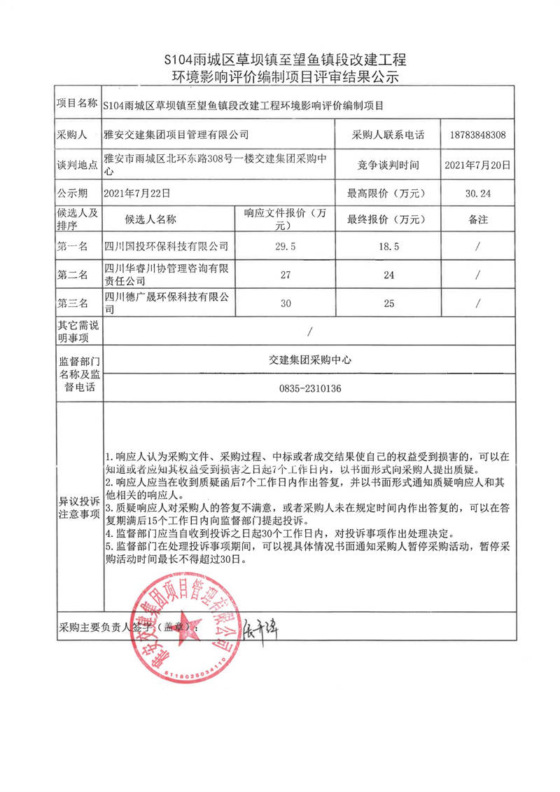 雅安交建集團項目管理有限公司S104雨城區(qū)草壩鎮(zhèn)至望魚鎮(zhèn)段改建工程環(huán)境影響評價編制項目評審結(jié)果公示