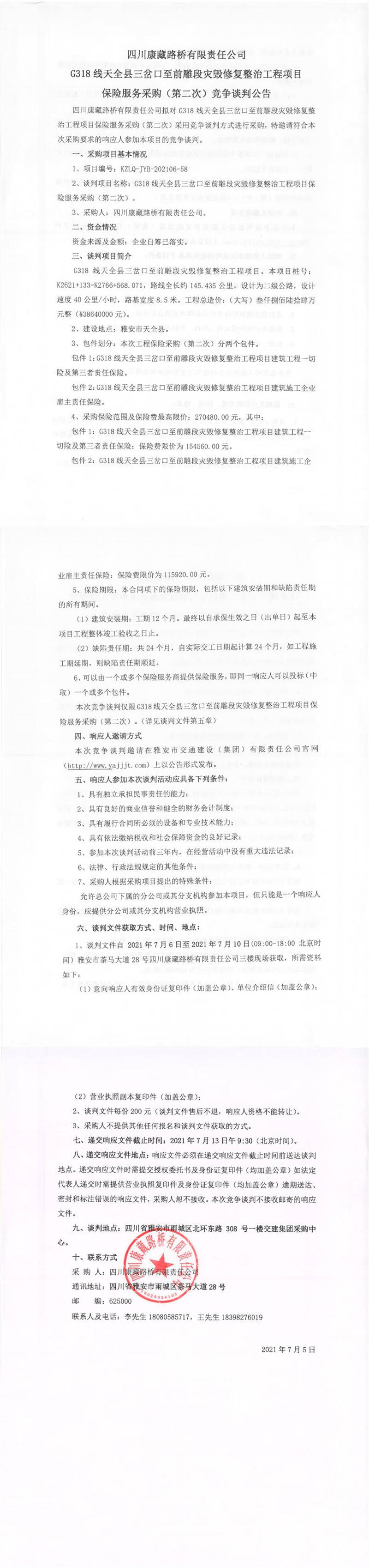 四川康藏路橋有限責(zé)任公司G318線天全縣三岔口至前雕段災(zāi)毀修復(fù)整治工程項(xiàng)目保險(xiǎn)服務(wù)采購(gòu)(第二次)競(jìng)爭(zhēng)談判公告