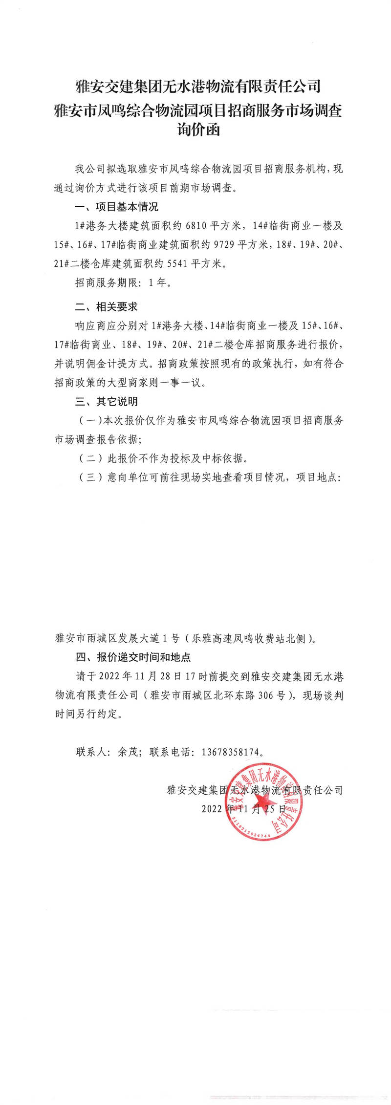 雅安交建集團(tuán)無水港物流有限責(zé)任公司雅安市鳳鳴綜合物流園項(xiàng)目招商服務(wù)市場調(diào)查詢價(jià)函