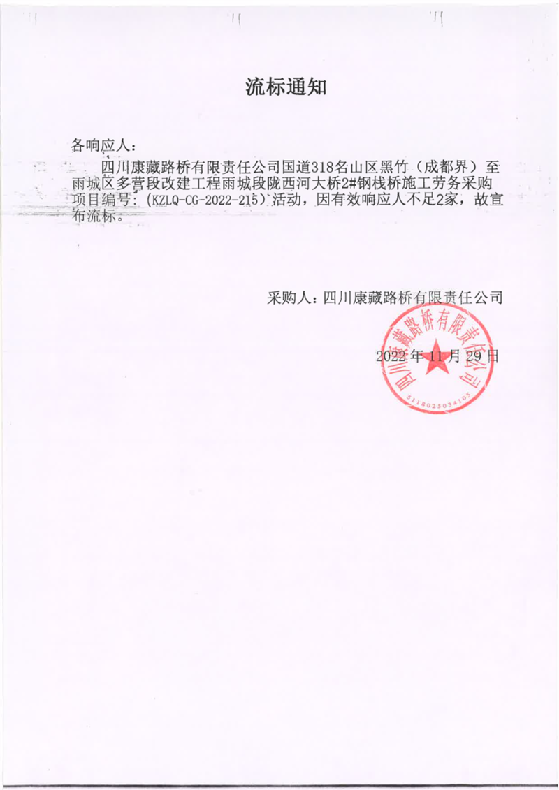 四川康藏路橋有限責(zé)任公司國道318名山區(qū)黑竹(成都界)至雨城區(qū)多營段改建工程雨城段隴西河大橋2#鋼棧橋施工勞務(wù)采購流標(biāo)通知
