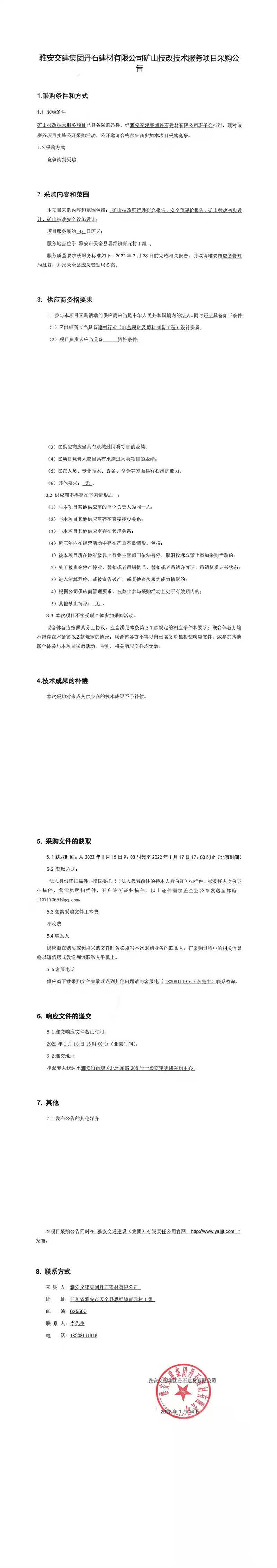雅安交建集團丹石建材有限公司礦山技改技術服務項目采購公告