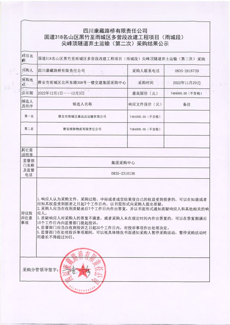 四川康藏路橋有限責(zé)任公司國(guó)道318名山區(qū)黑竹至雨城區(qū)多營(yíng)段改建工程項(xiàng)目(雨城段)尖峰頂隧道棄土運(yùn)輸(第二次)采購(gòu)結(jié)果公示