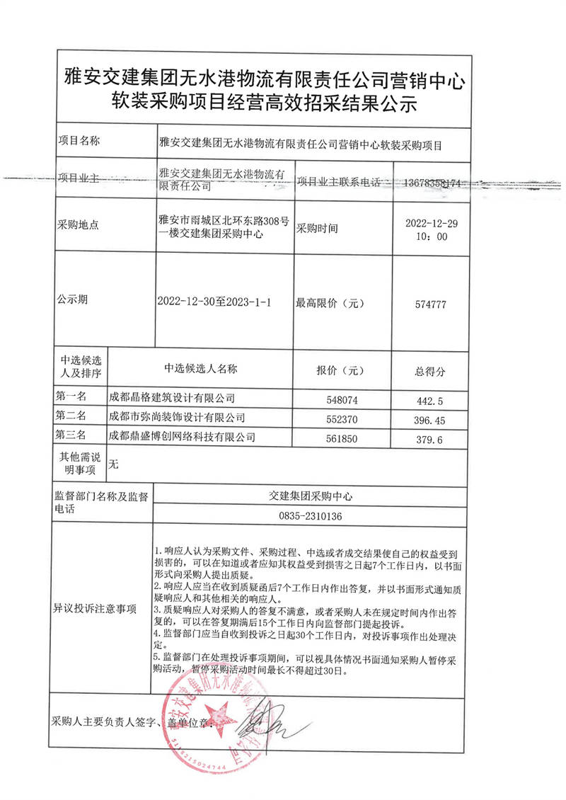 雅安交建集團(tuán)無(wú)水港物流有限責(zé)任公司營(yíng)銷中心軟裝采購(gòu)項(xiàng)目經(jīng)營(yíng)高效招采結(jié)果公示