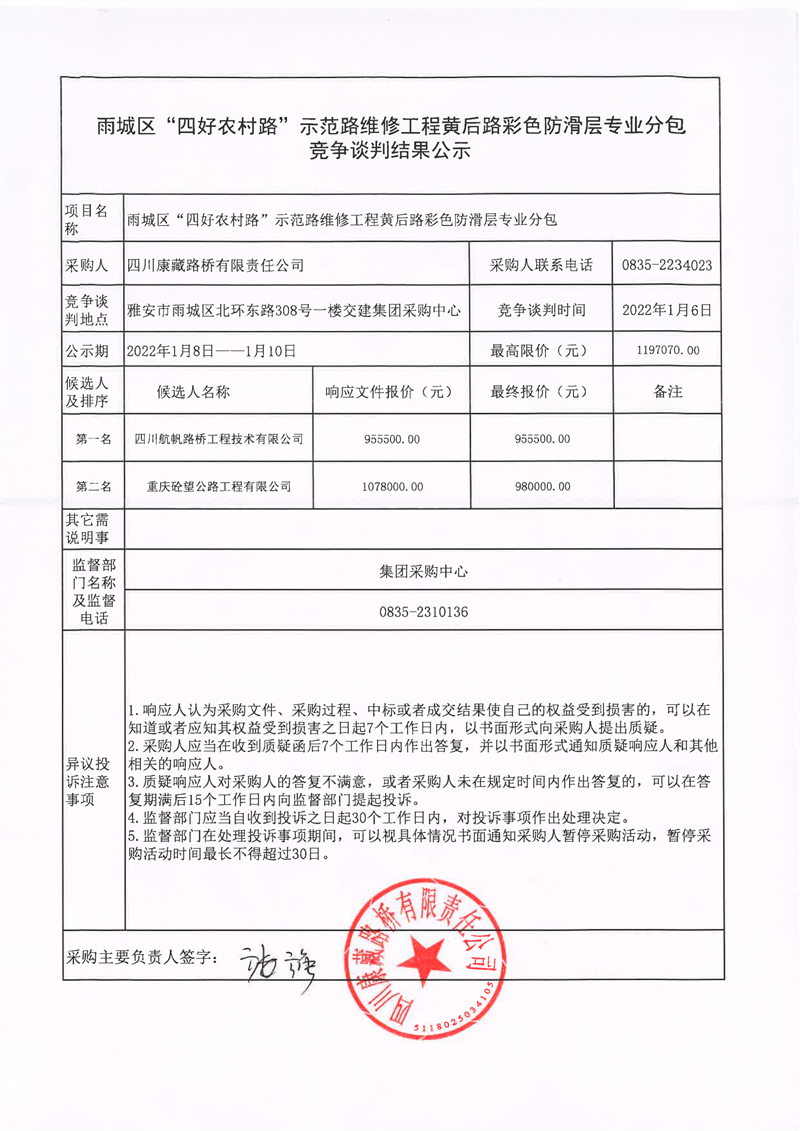 四川康藏路橋有限責任公司雨城區(qū)“四好農(nóng)村路”示范路維修工程黃后路彩色防滑層專業(yè)分包競爭談判結(jié)果公示