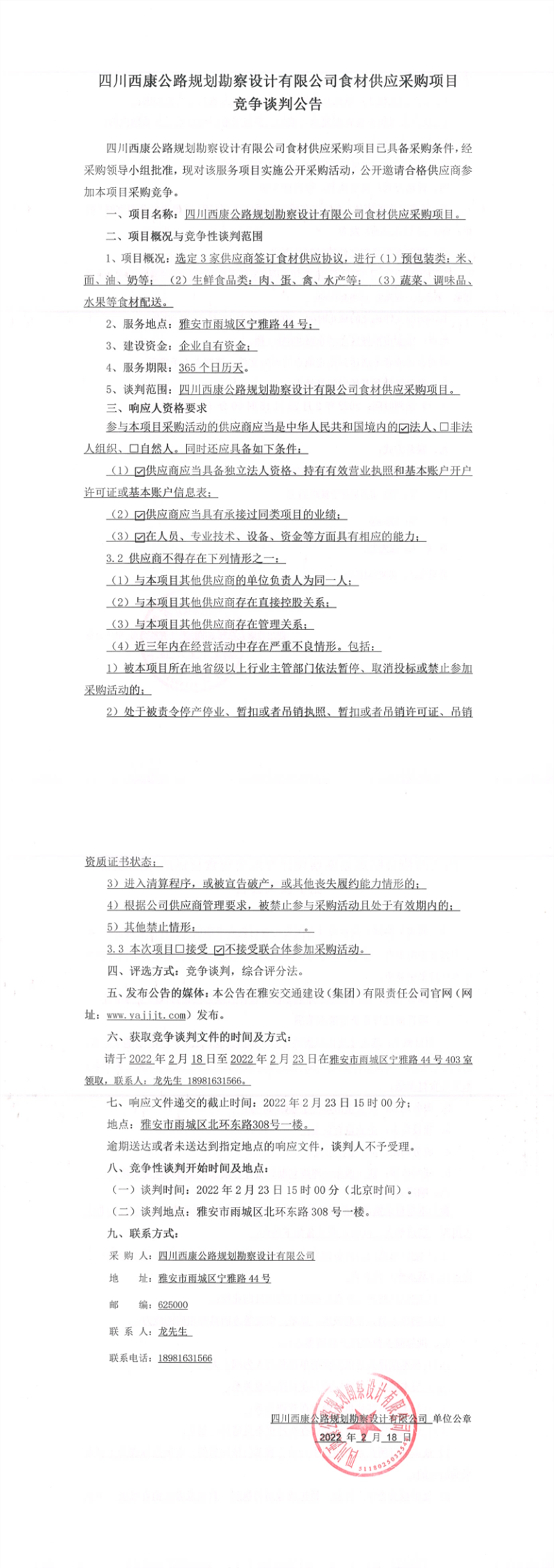 四川西康公路規(guī)劃勘察設(shè)計有限公司食材供應(yīng)采購項目競爭談判公告