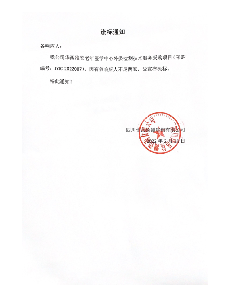 四川佳岳檢測(cè)咨詢有限公司華西雅安老年醫(yī)學(xué)中心外委檢測(cè)技術(shù)服務(wù)采購項(xiàng)目流標(biāo)通知