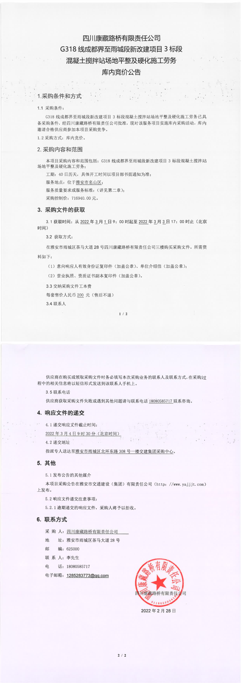 四川康藏路橋有限責任公司G318線成都界至雨城段新改建項目3標段混凝土攪拌站場地平整及硬化施工勞務庫內(nèi)競價公告