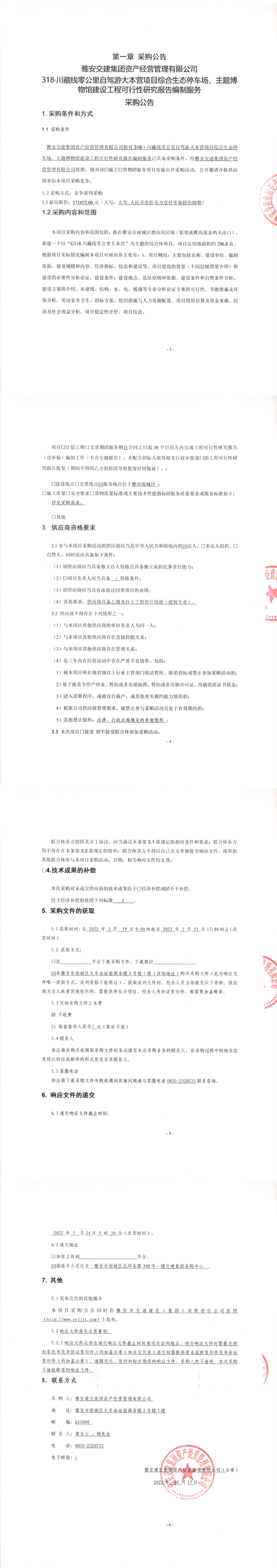 雅安交建集團資產(chǎn)經(jīng)營管理有限公司318.川藏線零公里自駕游大本營項目綜合生態(tài)停車場、主題博物館建設(shè)工程可行性研究報告編制服務(wù)采購公告