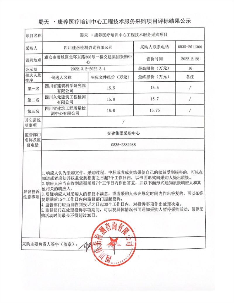 四川佳岳檢測咨詢有限公司蜀天.康養(yǎng)醫(yī)療培訓(xùn)中心工程技術(shù)服務(wù)采購項(xiàng)目評標(biāo)結(jié)果公示