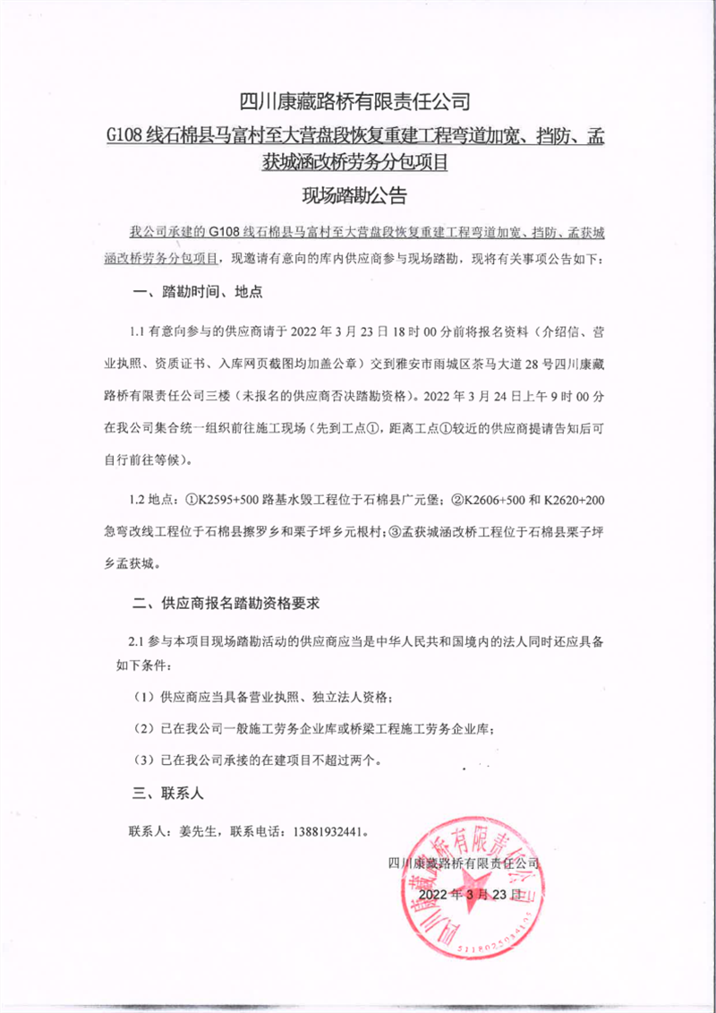 四川康藏路橋有限責(zé)任公司G108線石棉縣馬富村至大營盤段恢復(fù)重建工程彎道加寬、擋防、孟獲城涵改橋勞務(wù)分包項目現(xiàn)場踏勘公告