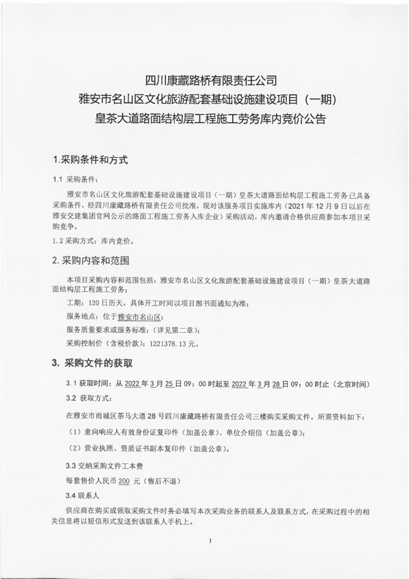 四川康藏路橋有限責(zé)任公司雅安市名山區(qū)文化旅游配套基礎(chǔ)設(shè)施建設(shè)項(xiàng)目(一期)皇茶大道路面結(jié)構(gòu)層工程施工勞務(wù)庫(kù)內(nèi)競(jìng)價(jià)公告