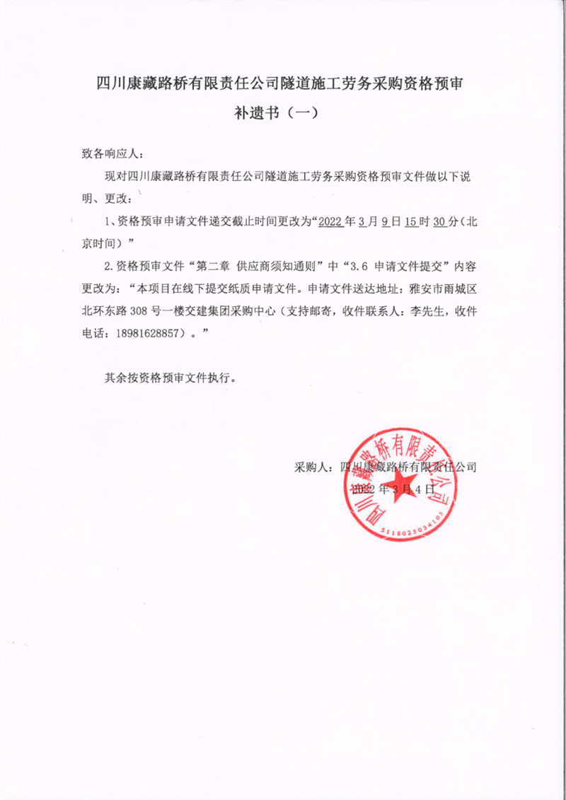 四川康藏路橋有限責(zé)任公司隧道施工勞務(wù)采購(gòu)資格預(yù)審補(bǔ)遺書(一)