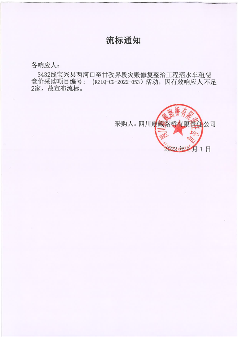 四川康藏路橋有限責(zé)任公司S432線寶興縣兩河口至甘孜界段災(zāi)毀修復(fù)整治工程灑水車租賃競價(jià)采購項(xiàng)目流標(biāo)通知
