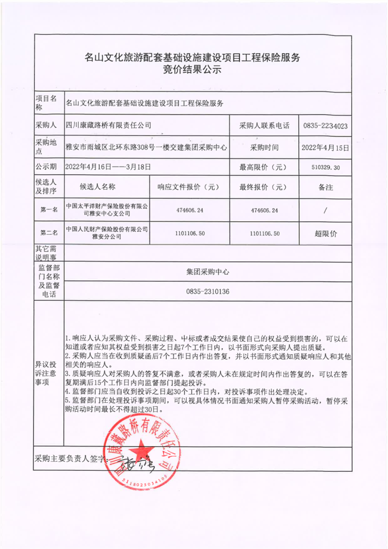 四川康藏路橋有限責(zé)任公司名山文化旅游配套基礎(chǔ)設(shè)施建設(shè)項(xiàng)目工程保險服務(wù)競價結(jié)果公示