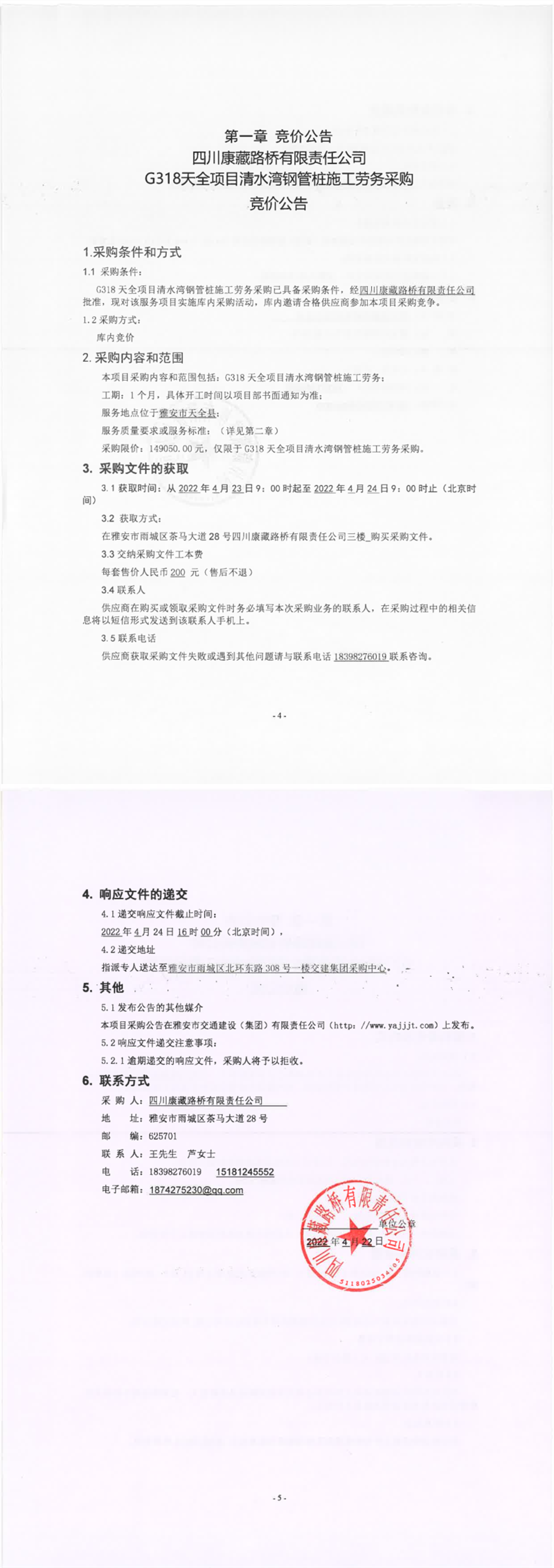四川康藏路橋有限責(zé)任公司G318天全項(xiàng)目清水灣鋼管樁施工勞務(wù)采購競價(jià)公告