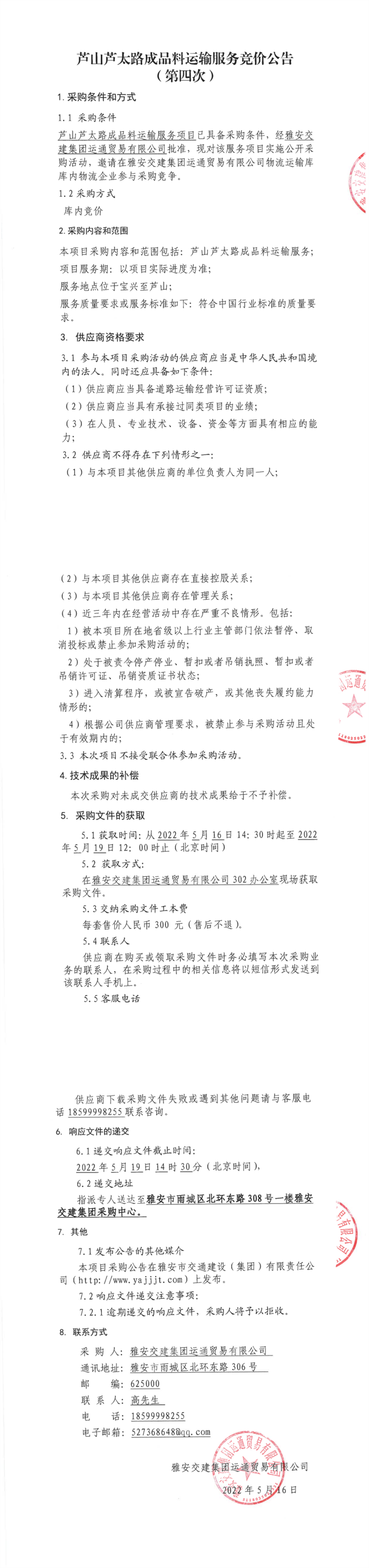 雅安交建集團運通貿易有限公司蘆山蘆太路成品料運輸服務競價公告(第四次)