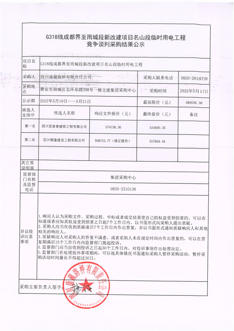 四川康藏路橋有限責(zé)任公司G318線成都界至雨城段新改建項(xiàng)目名山段臨時(shí)用電工程競(jìng)爭(zhēng)談判采購結(jié)果公示