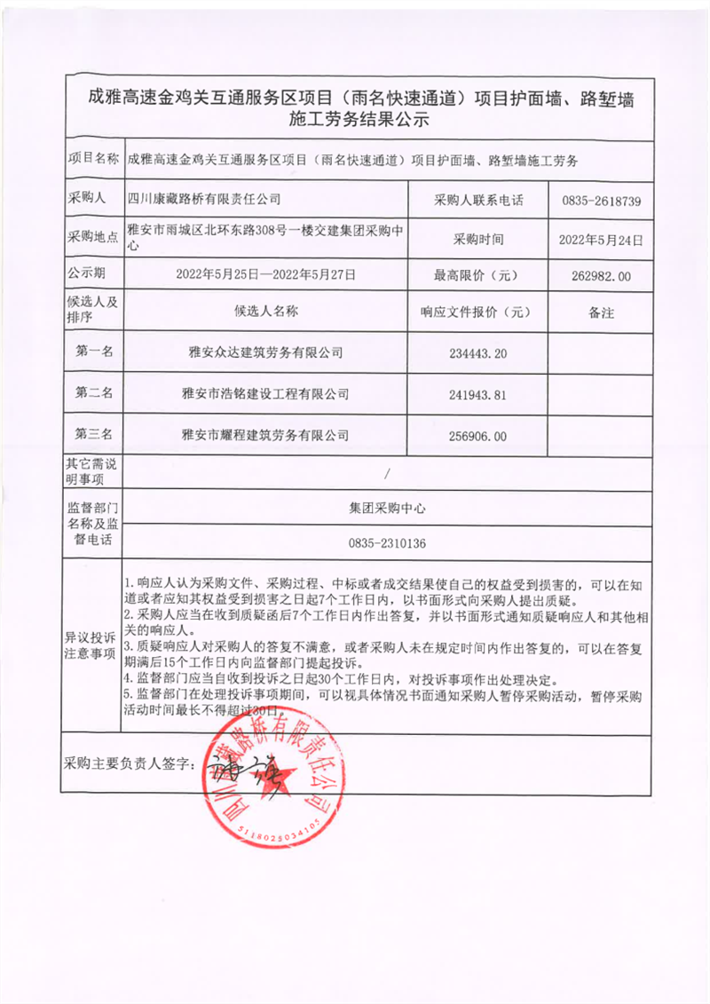 四川康藏路橋有限責(zé)任公司成雅高速金雞關(guān)互通及服務(wù)區(qū)項目(雨名快速通道)項目護(hù)面墻、路塹墻施工勞務(wù)結(jié)果公示