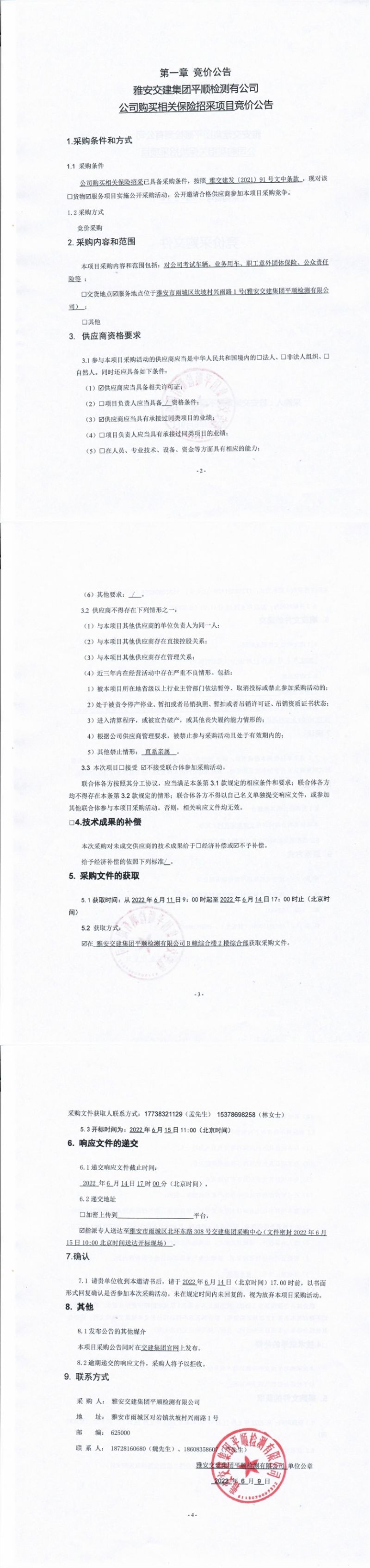 雅安交建集團(tuán)平順檢測(cè)有限公司公司購(gòu)買(mǎi)相關(guān)保險(xiǎn)招采項(xiàng)目競(jìng)價(jià)公告