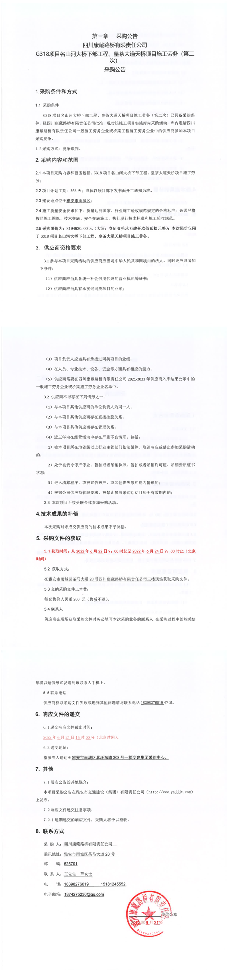 四川康藏路橋有限責(zé)任公司G318項(xiàng)目名山河大橋下部工程、皇茶大道天橋項(xiàng)目施工勞務(wù)(第二次)采購(gòu)公告