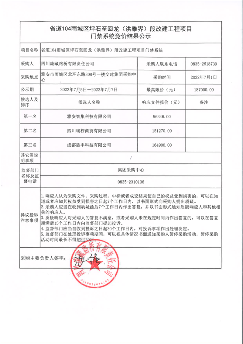 四川康藏路橋有限責(zé)任公司省道104雨城區(qū)坪石至回龍(洪雅界)段改建工程門(mén)禁系統(tǒng)競(jìng)價(jià)結(jié)果公示