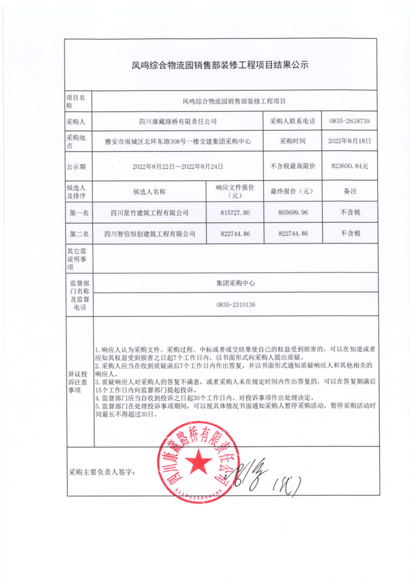 四川康藏路橋有限責(zé)任公司鳳鳴綜合物流園銷(xiāo)售部裝修工程項(xiàng)目結(jié)果公示