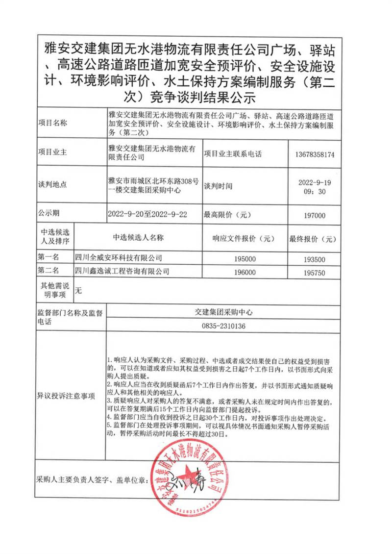雅安交建集團(tuán)無水港物流有限責(zé)任公司廣場、驛站、高速公路道路匝道加寬安全預(yù)評價、安全設(shè)施設(shè)計、環(huán)境影響評價、水土保持方案編制服務(wù)(第二次)競爭談判結(jié)果公示