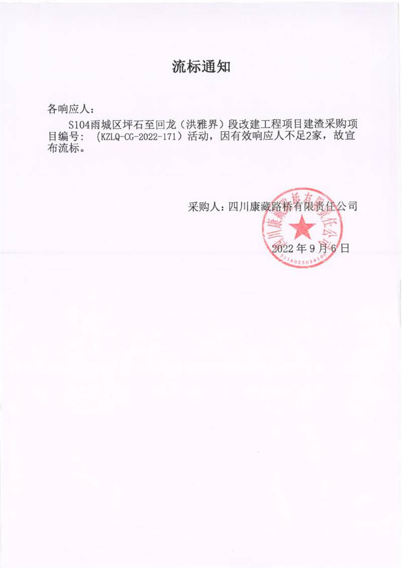 四川康藏路橋有限責(zé)任公司S104雨城區(qū)坪石至回龍(洪雅界)段改建工程項目建渣采購項目流標(biāo)通知