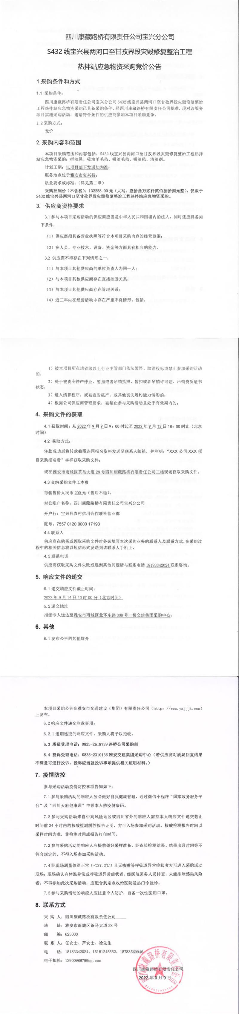 四川康藏路橋有限責(zé)任公司S432線寶興縣兩河口至甘孜界段災(zāi)毀修復(fù)整治工程熱拌站應(yīng)急物資采購競價公告