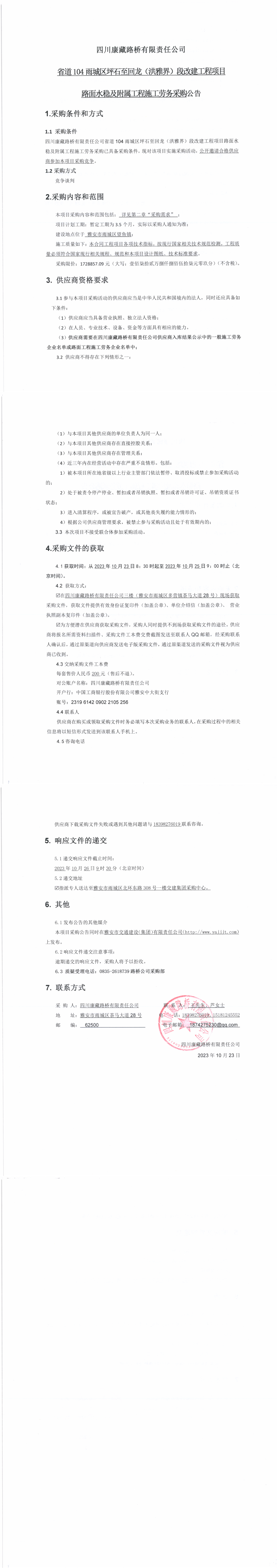 四川康藏路橋有限責(zé)任公司省道104雨城區(qū)坪石至回龍(洪雅界)段改建工程項(xiàng)目路面水穩(wěn)及附屬工程施工勞務(wù)采購(gòu)公告