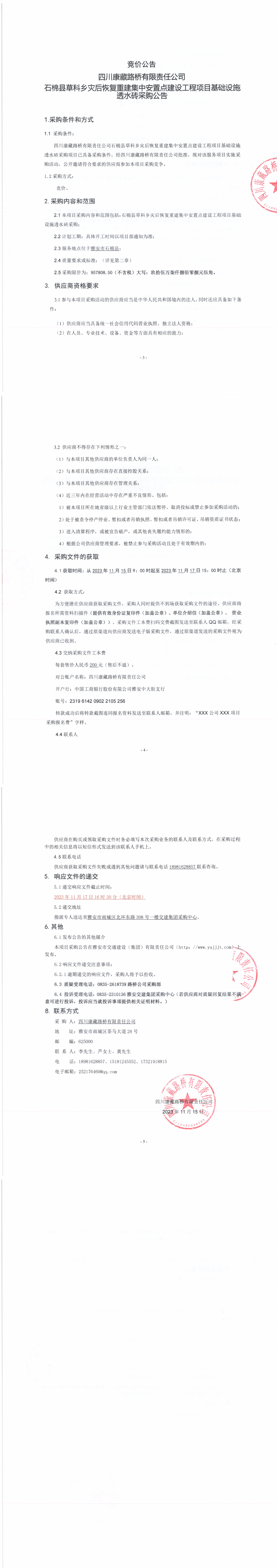 四川康藏路橋有限責(zé)任公司石棉縣草科鄉(xiāng)災(zāi)后恢復(fù)重建集中安置點(diǎn)建設(shè)工程項(xiàng)目基礎(chǔ)設(shè)施透水磚采購公告