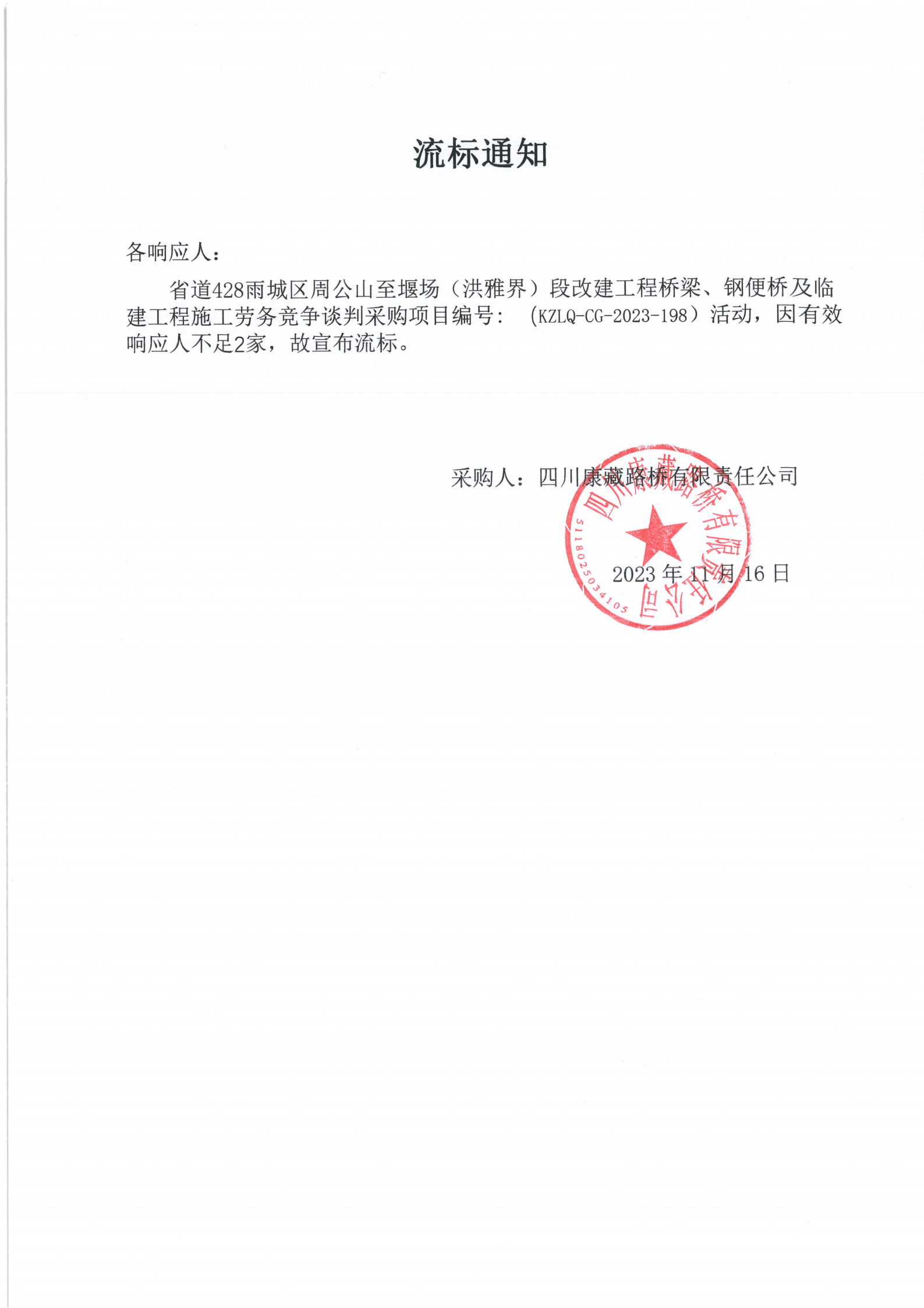四川康藏路橋有限責(zé)任公司省道428雨城區(qū)周公山至堰場(洪雅界)段改建工程橋梁、鋼便橋及臨建工程施工勞務(wù)采購流標(biāo)通知