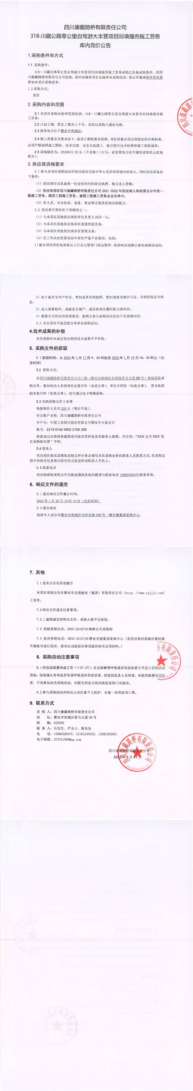 四川康藏路橋有限責任公司318.川藏公路零公里自駕游大本營項目回填強夯施工勞務庫內(nèi)競價公告