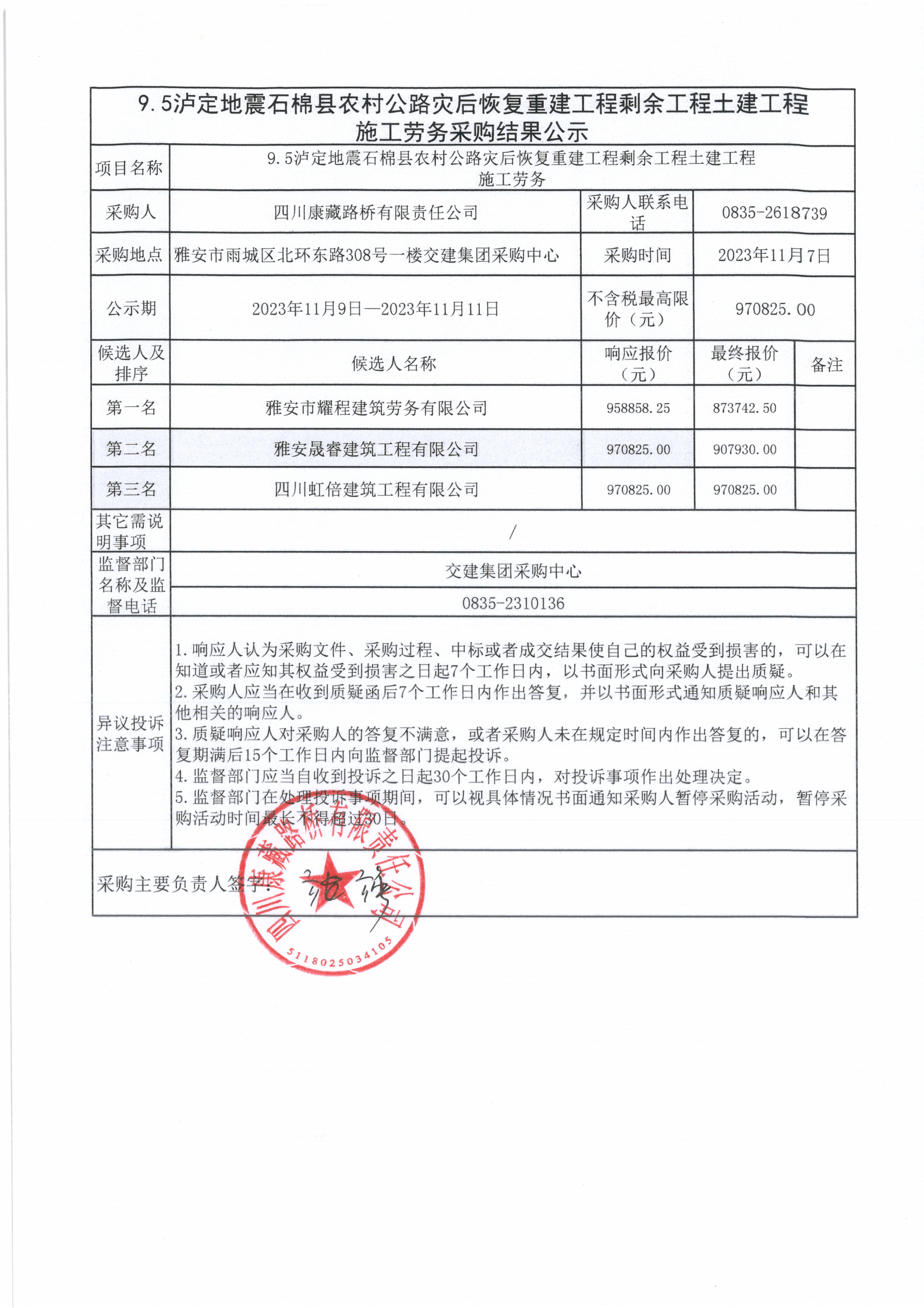 四川康藏路橋有限責(zé)任公司9.5瀘定地震石棉縣農(nóng)村公路災(zāi)后恢復(fù)重建工程剩余工程土建工程施工勞務(wù)采購結(jié)果公示