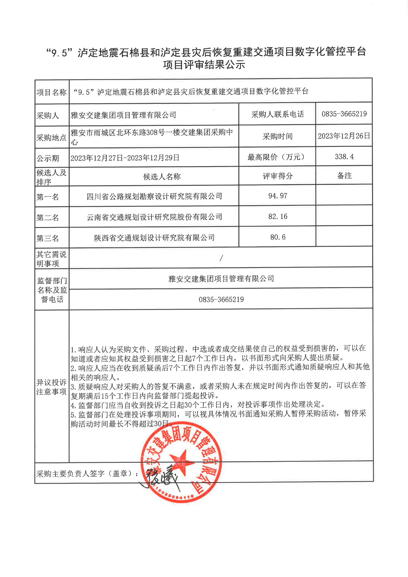 雅安交建集團項目管理有限公司“9.5”瀘定地震石棉縣和瀘定縣災后恢復重建交通項目數字化管控平臺項目評審結果公示