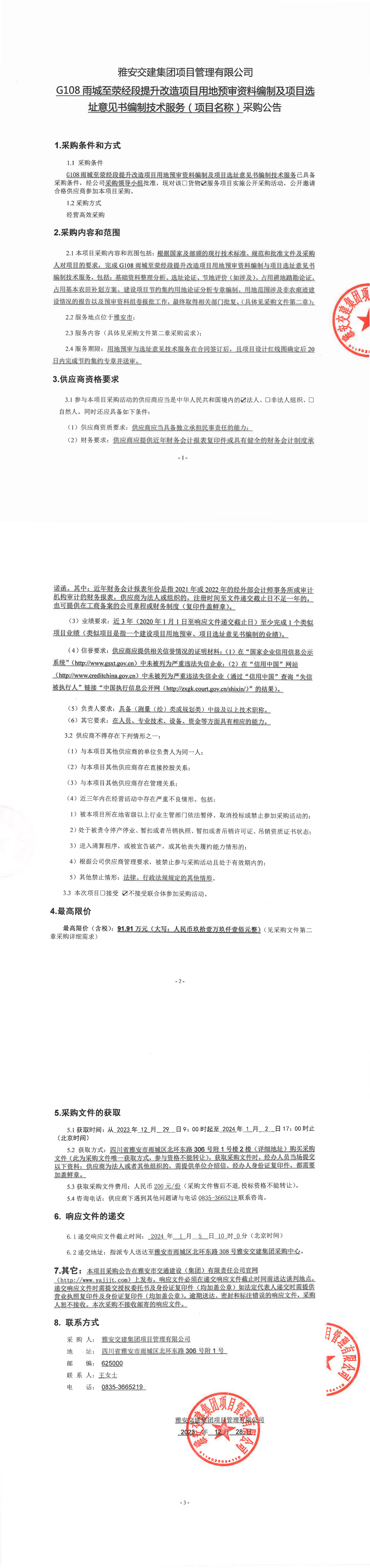 雅安交建集團(tuán)項目管理有限公司G108雨城至滎經(jīng)段提升改造項目用地預(yù)審資料編制及項目選址意見書編制技術(shù)服務(wù)(項目名稱)采購公告