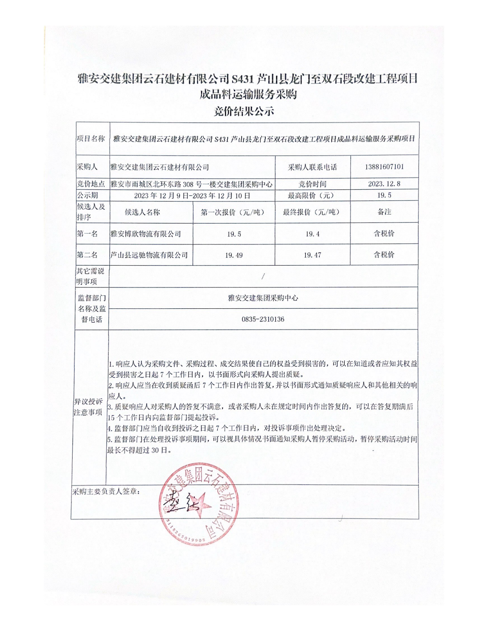 雅安交建集團(tuán)云石建材有限公司S431蘆山縣龍門至雙石段改建工程項(xiàng)目成品料運(yùn)輸服務(wù)采購(gòu)競(jìng)價(jià)結(jié)果公示