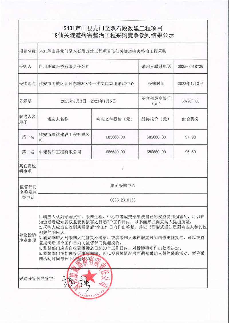 四川康藏路橋有限責(zé)任公司S431蘆山縣龍門至雙石段改建工程項(xiàng)目飛仙關(guān)隧道病害整治工程采購(gòu)競(jìng)爭(zhēng)談判結(jié)果公示