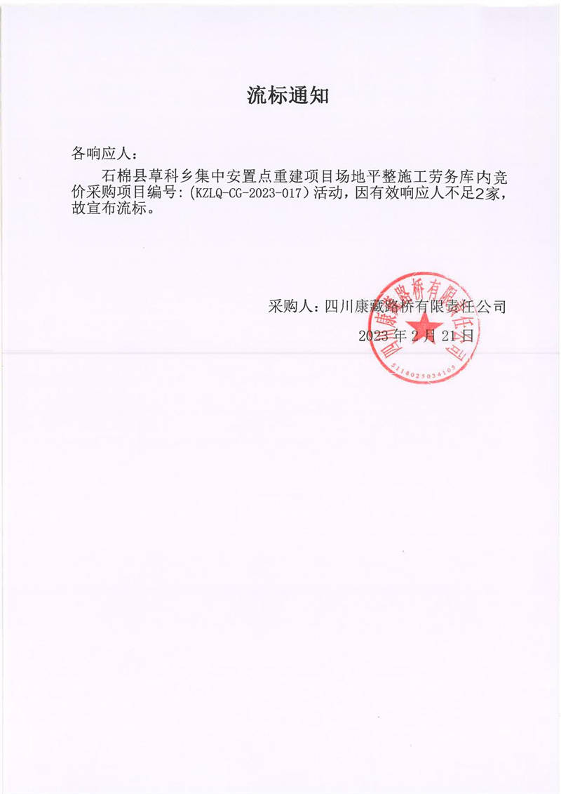 四川康藏路橋有限責(zé)任公司石棉草科鄉(xiāng)集中安置點(diǎn)重建項(xiàng)目場地平整施工勞務(wù)庫內(nèi)施工勞務(wù)庫內(nèi)采購流標(biāo)通知