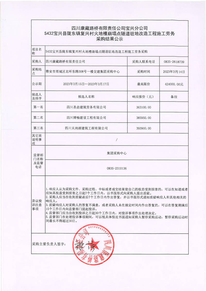 四川康藏路橋有限責任公司寶興分公司S432寶興縣隴東鎮(zhèn)復興村火地槽崩塌點隧道駐地改造工程施工勞務采購結(jié)果公示
