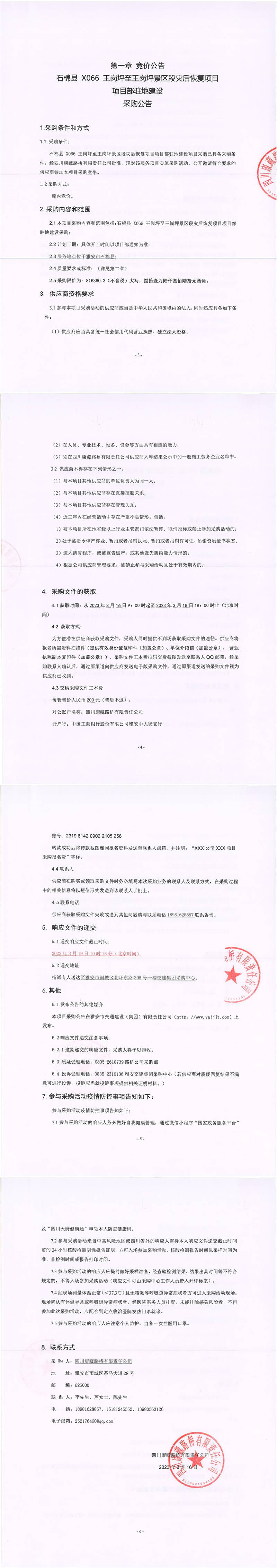四川康藏路橋有限責任公司石棉縣X066王崗坪至王崗坪景區(qū)災后恢復項目項目部駐地建設采購公告
