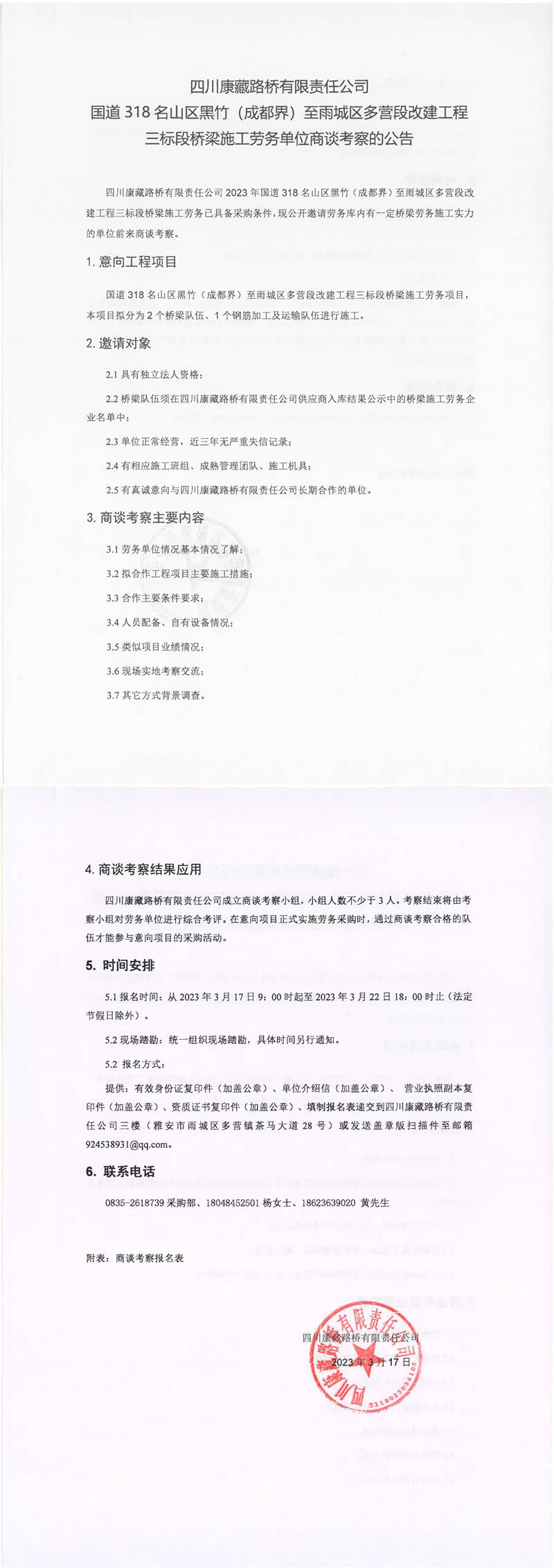四川康藏路橋有限責(zé)任公司國道318名山區(qū)黑竹(成都界)至雨城區(qū)多營段改建工程三標段橋梁施工勞務(wù)單位商談考察的公告