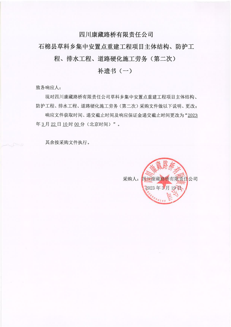四川康藏路橋有限責(zé)任公司石棉縣草科鄉(xiāng)集中安置點重建工程項目主體結(jié)構(gòu)、防護(hù)工程、排水工程、道路硬化施工勞務(wù)(第二次)補遺書(一)