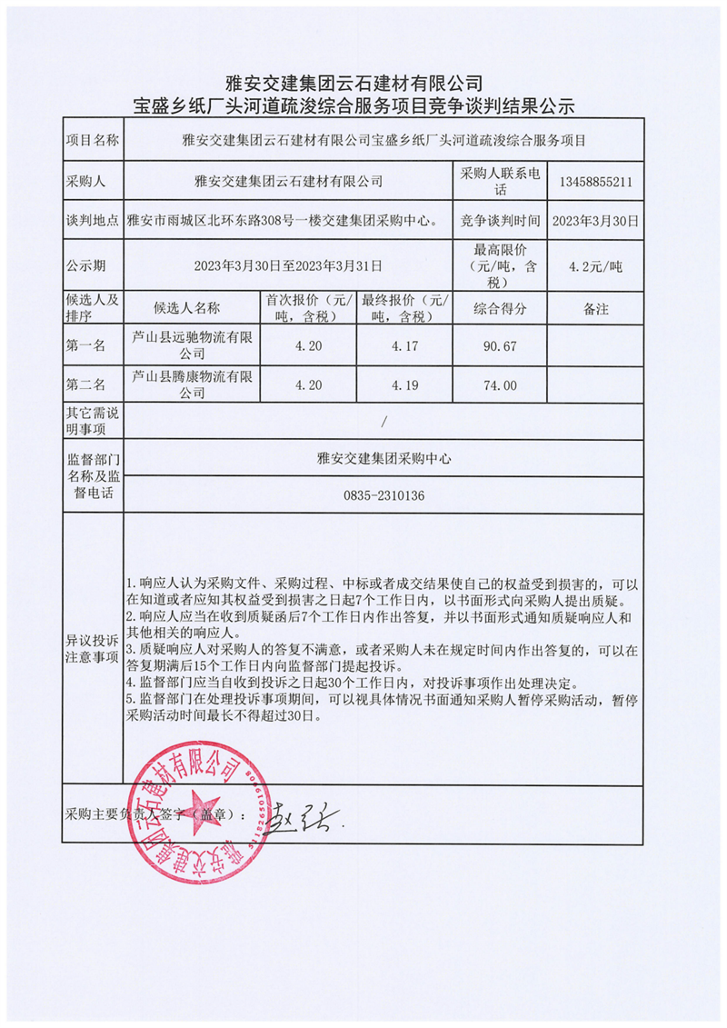 雅安交建集團(tuán)云石建材有限公司寶盛鄉(xiāng)紙廠頭河道疏浚綜合服務(wù)項(xiàng)目競(jìng)爭(zhēng)談判結(jié)果公示
